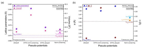 Figure 1 shows the lattice parameters and volume calculated in comparison with the experimental results using the GGA/PBE approximation with different pseudopotential methods for the cubic (Pmm) and tetragonal (P4mm) phases of PbTiO3. While the detailed calculation of the lattice parameters, c/a tetragonality and volume deviations are presented in the Supplementary Materials Section (Table S1).