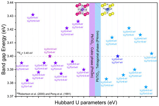 Comparison between the calculated band gaps of the cubic and tetragonal phases of PbTiO3 with experimental data highlighting the Hubbard U parameters chosen for the O–2p and Ti–3d orbitals; the value of Ud(Pb) has been fixed at 0 eV. For the cubic and tetragonal phases of PbTiO3, the distinct colors of the Hubbard U parameters (Up(O) = 3.5 eV and Ud(Ti) = 6 eV for the cubic phase, and Up(O) = 5 eV and Ud(Ti) = 7 eV for the tetragonal phase) result in a gap energy in perfect agreement with the value obtained experimentally. The star symbols symbolize the Hubbard U parameters used for Up(O) and Ud(Ti), with Ud(Pb) kept at 0 eV. [a] Experimental data from Robertson et al. [14] and Peng et al. [15].
