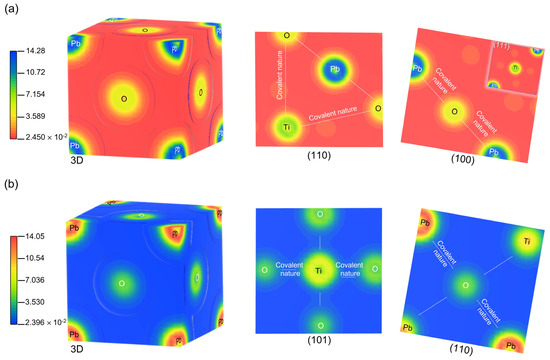 Electron density distribution maps in (3D) and (2D) in the most significant crystallographic planes of PbTiO3 for (a) the cubic phase and (b) the tetragonal phase, respectively. For the cubic phase, the blue and green regions surrounding the Pb or Ti atom indicate electron enrichment, while the yellow and orange regions indicate electron loss. In the case of the tetragonal phase, this is reversed.