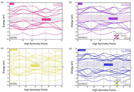 By applying the GGA/PBE approximation only (Figure 6a,c), an indirect band gap of 2.207 eV and 2.213 eV at the M–G and X–G points is shown as characteristic of the band structure of the cubic and tetragonal phases of PbTiO3, respectively. However, this obtained gap energy value is still much lower than the experimentally obtained one (3.40 eV). Thus, for overcoming the limitations of the GGA, Hubbard U correction was added to the GGA/PBE approximation, as discussed before, resulting in a band gap of 3.400 eV (Figure 6b,d), which is in quite good agreement with the experimental results [14,15]. Because of this, the accuracy of our calculations following optimization and the selection of Hubbard parameters for the cubic and tetragonal phases supports the applicability of the used model.