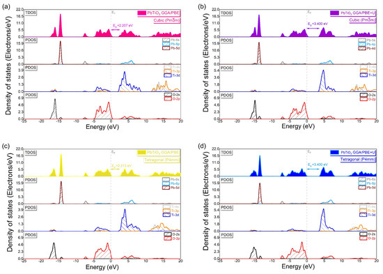 We computed the total (TDOS) and partial (PDOS) densities of states along with a diagram of the electronic orbital distributions of the cubic and tetragonal phases of PbTiO3 in order to understand the electronic properties, and in particular the atomic orbital contributions in the development of each energy band (Figure 7). With and without the Hubbard correction, the PDOS analysis shows the same electronic contributions (Figure 7a–d) where the VB consists predominantly of contributions from the 2p and 2s orbitals of oxygen and the 5d orbitals of lead, with minor contributions from the 3d and 6s orbitals of titanium and lead, respectively. The 3d titanium and 6p lead orbitals make up the majority of the CB, whereas the 2p oxygen orbitals make up a small portion of it. In addition, the 3p and 4s titanium orbitals contribute to the conduction bands at higher energies. Figure 8 illustrates this graphically, showing an indirect band gap at the M–G and X–Z points for the cubic and tetragonal phases, respectively, in which the top of the VBs is created by the O 2p orbitals as the bottom of the CBs is formed by the Ti 3d orbitals. From Figure 7, it is evident that the application of the Hubbard U potential correction leads to an increase in the intensity of the 3d orbital of titanium, accompanied by a displacement of 1.187 eV of the CB toward higher energies, which allows restoring the experimental band gap of the tetragonal phase (3.40 eV) [14,15] and this compensates for the systematic error of the GGA approximation.