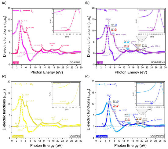 The optical properties of materials have demonstrated themselves to be a valuable means of understanding and confirming the results obtained from the investigation of electronic properties. The following section systematically compares the optical properties of the cubic and tetragonal phases of PbTiO3, with and without the Hubbard U correction, with the existing experimental findings. Figure 9 shows the imaginary and real parts of the dielectric function of PbTiO3 with and without the Hubbard U correction. We will start by discussing the imaginary portion of the dielectric function, which is tightly related to the electronic band structure and shows the light absorption in the material. Using only the GGA/PBE approximation, the ε2 curve for the cubic and tetragonal phases indicates an energy of ~2.207 eV and ~2.213 eV, respectively, at the B0 point (see inset of Figure 9a,c), which is representative of the gap energy of PbTiO3. The Hubbard U potential correction to the cubic and tetragonal phases results in a shift of the CB toward higher energies of 1.193 eV and 1.187 eV, respectively. This reproduces the experimental band gap of 3.40 eV at the B1 point [14,15] (see inset of Figure 9b,d) and corrects the systematic discrepancy of the GGA approximation. From Figure 9a–d, the critical peaks of the optical ε2 spectra are denoted by A1, A2, A3, A4 and A5, all of which are shifted after the application of the U-correction to higher energies. The transition from O–2p (VBM) to Ti–3d (CBM) orbitals is mostly represented by the A1 and A2 peaks, whereas the transition from O–2p (VBM) to Pb–6p (CB) orbitals is primarily represented by the A3 peak. Moreover, the optical peaks A4 and A5 are associated with internal electronic excitation transitions of the Pb–5d and O–2s orbitals near VB to the CB semi-core states. It is necessary to note that each peak in ε2 is not always connected to a single interband transition because the band structure might contain many direct or indirect transitions with the same energy corresponding to the same peak. Our obtained ε2 data computed by GGA/PBE + U in the broad energy ranges agree with the currently available experimental findings of the cubic and tetragonal phases of PbTiO3 in the 0–6 eV range [41,42]; the other transitions were determined on the basis of our obtained results of densities of states (Figure 7) and agree similarly with the experimental and theoretical data of BaTiO3 and SrTiO3, which have been determined in broad energy ranges [43,44,45,46]. With respect to the real part of the dielectric function, similar results were observed to the imaginary part, where the calculated ε2(0) for the cubic (tetragonal) phase are about 6.30 eV (6.53 eV) and 6.95 eV (7.30 eV), respectively, in the case of GGA/PBE and GGA/PBE + U.