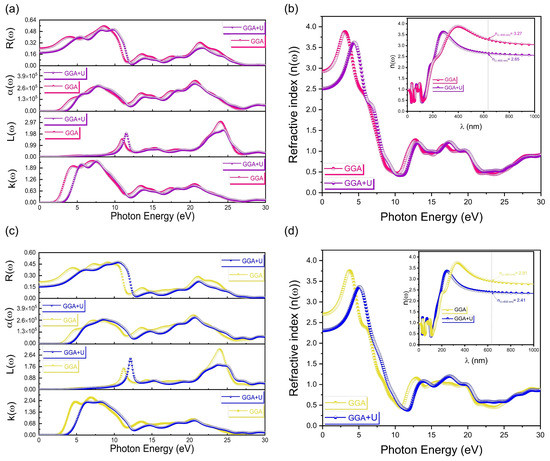 With and without the Hubbard U correction, the calculated results for the energy dependence of the extinction coefficient k(ω), energy loss function L(ω), optical absorption coefficient α(ω) and reflectivity R(ω) of the cubic and tetragonal phases of PbTiO3 are shown in Figure 10a,c. As we can see, after the addition of the Hubbard U correction to the GGA approximation, a shift in the optical property spectrum toward higher energy is observed, which leads to correcting and increasing the gap energy of PbTiO3. From Figure 10b,d, the refractive index n(ω) shows the same behavior after applying the Hubbard U correction.