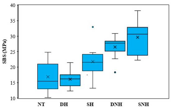 Figure 4 presents the SBS box plot results. Differences in SBS were observed between the groups. The SNH and DNH groups showed the highest SBS values compared to the NT and DH groups, for which the SBS values were the lowest. The SH group presented an intermediate mean value for SBS.