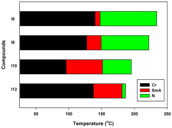 The following supporting information can be downloaded at: https://www.mdpi.com/article/10.3390/ma16124304/s1, Figures S1–S3: DCS thermograms of compounds I6, I10 and I12; Figure S4: POM textures of compound I10; Tables S1–S2: Mesomorphic and thermal parameters of compounds In and IIn.