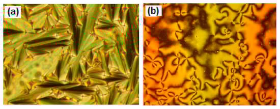 POM textures of l8 compound during heating: (a) SmA phase at 140 °C and (b) N phase at 180 °C.