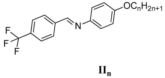 The comparison of our current series to previously described similar two-ring materials, IIn (Figure 5) [47], is interesting. According to the most recent data for the IIn series [47], all compounds are mesomorphic and have purely nematic phase types with either enantiotropic or monotropic LC phases, mainly depending on the type of terminal moiety. It can be concluded that the smectic A phases were reported to be generated in the present series In by adding extra phenyl ester moiety to the molecular structure of IIn, and the resulting phase displayed a wide mesomorphic range and stability. This comparison shows that the current compounds produce more orderly mesophases because their mesogenic parts are longer, typically stabilizing the observed phases.