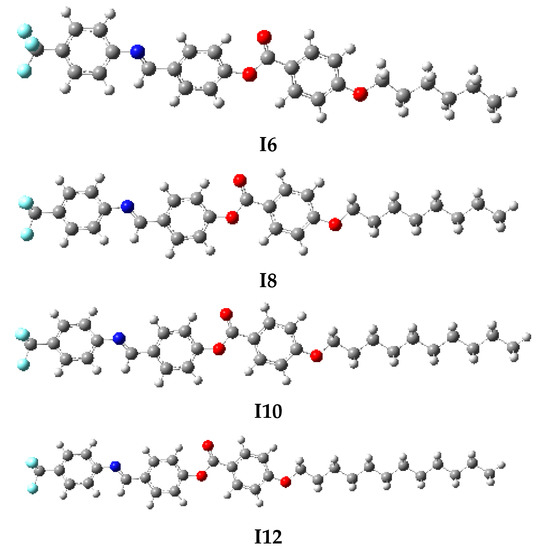 The co-planarity of the liquid crystals is a critical and vital factor in determining mesophase behavior. Furthermore, in the liquid crystalline condensed phase, the degree of packing of molecules is highly dependent on their ability to maintain their planar shape. Figure 6 shows that all structures are almost planar, but the orientation of the two terminal aryl rings with respect to the central benzene ring is out of the molecular plane by around 4.0° and 0.7°. Such small dihedral angle values suggest an insignificant deviation from the planarity of the whole molecule. Moreover, the results show that the molecular geometry, especially the planarity of molecules, does not change considerably upon extending the terminal alkyloxy chain length. As a result, the molecular planarity of homologous series In enhances and boosts the degree to which molecules are packed together in the condensed mesomorphic phase.