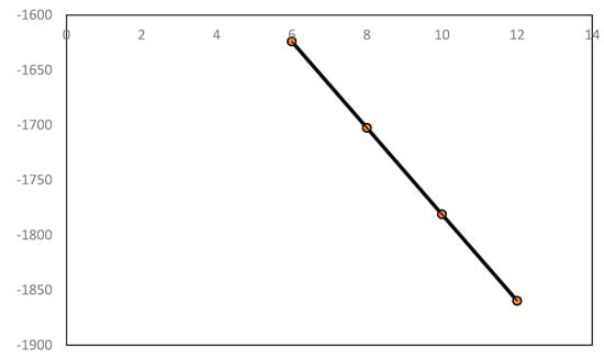 To find out the relationship between the stability of the studied molecules and the length of the terminal alkoxy chain, the calculated thermal energy of the homologue series In was correlated to the terminal alkoxy chains length (Figure 7). As indicated in Figure 7, a molecule’s stability increases in proportion to the length of the alkoxy chain at its terminal position. The aromatic rings’ high stacking and the aggregation of the alkoxy chains might explain these observations. In terms of benzene ring stacking, the strength of the aggregation rises as the length of the alkoxy chains grows.