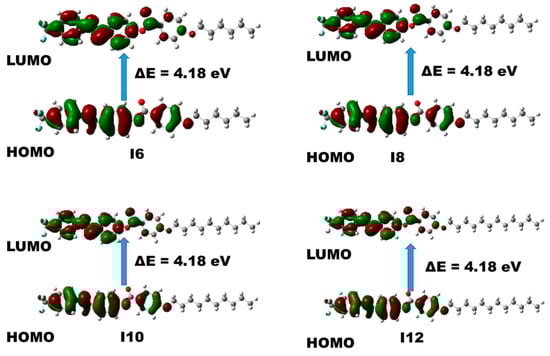 The calculations revealed that the investigated compounds have a relatively small energy gap ΔE (4.18 eV), indicating that the title molecules are soft and reactive. Moreover, as shown in Figure 8, the electron densities of the FMOs are mostly localized on the aryl rings. At the same time, there was no noticeable contribution of the terminal alkyloxy chain to the FMOs. It can be noted that both frontier orbitals have a nearly identical shape in all the investigated molecules.