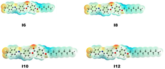 The electronic density distribution is shown by the molecular electrostatic potential energy surface (MEP), is a helpful metric that gives some insight on a chemical compound’s electrophilic and nucleophilic centers. Moreover, MEP describes hydrogen-bonding interactions between the molecules. MEP of the In series has been calculated utilizing optimal compound geometry at B3LYP/6-31+G(d,p). A greater electron density characterizes the MEP’s negative sites (red) and is regarding with nucleophilic reactivity. Electrophilicity refers to the positive sites, which are either green or blue and have a low electron density. Our potential map’s energy range is −4.576 × 10−2 esu to + 4.576 × 10−2 esu. In series, as shown in Figure 9, the O, N, and F centers have high electron density and represent the nucleophilic part. In contrast, the low electron density is observed surrounding the alkyl chain.