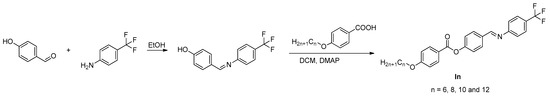 Based on the above formation, the study aims to prepare a new Schiff base with ester-derived liquid crystals and investigate the terminal benzotrifluoride moiety’s influence on the resulting derivatives’ phase behaviors. Therefore, a series of LCs (In), namely, (E)-4-(((4-(trifluoromethyl) phenyl) imino) methyl) phenyl 4-(alkyloxy)benzoate, (Figure 1), were synthesized. The length of the terminal carbon chain attached to an end, where hexyloxy, octyloxy, decyloxy, and dodecyloxy chains are utilized, distinguishes the compounds in the series from one another. DSC and POM instruments were used in the LC study for the novel series to characterize the thermal and mesomorphic behavior. DFT will be used as a theoretical structure to examine these findings. Additionally, these computations show how the terminal moieties influence mesomorphic properties.