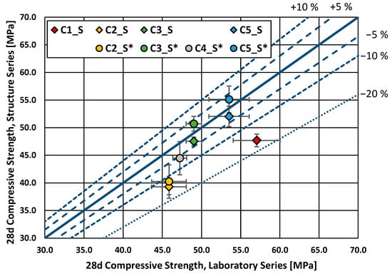 The compressive strength of the structure series was lower than that of the laboratory series. A difference of up to 17% was found for the series C1_S. In contrast, two structure* series performed slightly better (by around 3%) on average than the laboratory series: C3_S* and C5_S*. This difference may be explained by the test accuracy or data scatter since only three specimens were tested for each series. The compressive strength of the structure series was, on average, 10% lower than that of the laboratory series, whereas the compressive strength of the structure* series was only around 3% lower on average than the laboratory series. The compressive strength of the laboratory series reflected the compressive strength class stated in the delivery documents of each concrete. Figure 4 provides the results of the compressive strength test for all the analyzed series.