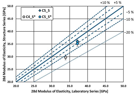 Modulus of elasticity, structure series vs. laboratory series (28 d).