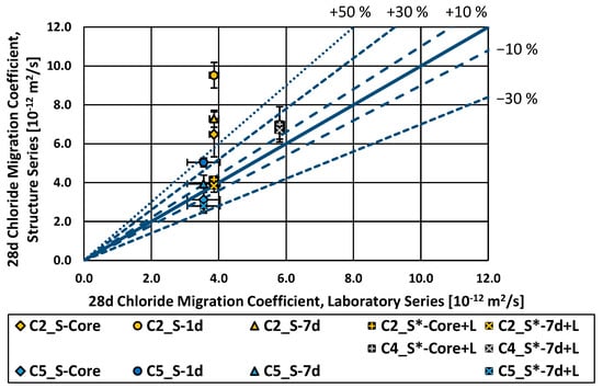 Figure 6 presents the results of the rapid chloride migration test. Figure 7 provides a detailed view of the lower left corner of Figure 6. The chloride migration coefficients of the “S-Core” and “S-7d” series were, on average, 16% higher (worse) in relation to the laboratory series; the “S-1d” series, 50% higher (worse) on average; the “S*-Core” series, around 14% higher (worse) on average. Only the series “S-14 d” and “S*-7 d + L” had a performance comparable to the laboratory series. The effect of curing can be clearly seen, as the performance of the test series improves with longer curing periods. The chloride migration coefficient values of the laboratory series fell in ranges similar to the ones found in [] for the concrete composition (cement type and w/c-ratio).