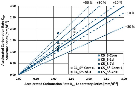 Accelerated carbonation rate (3% CO2), structure series vs. laboratory series.
