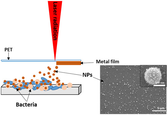 The bacterial biofilms were treated with silver (99.99%) and copper (99.99%) nanoparticles obtained using the laser-induced forward transfer of a thin metal layer from polyethylene films. The metal films were deposited using the method of magnetron sputtering in an argon atmosphere. The film thickness was controlled by measurements on a Certus Standard V scanning atomic force microscope (NanoScanTechnology, Dolgoprudnyy, Russia), and was 100 ± 10 nm. The transfer was carried out on a HTF MARK nanosecond fiber laser (Bulat, Zelenograd, Russia) with a wavelength of 1064 nm, and a pulse duration of 100 ns. The energy in the pulse was 0.2 mJ. The radiation was focused on the film using an F-theta lens with a focal length of 160 mm. There was a gap of 1–2 mm between the metal film and the glass slide with bacterial biofilm on which the transfer was carried out (Figure 1) [10,11].