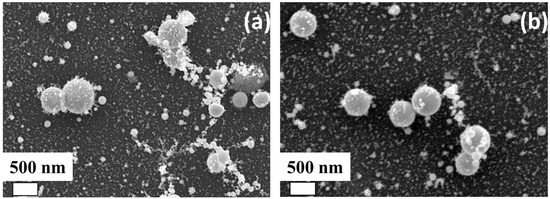 The topography of the samples was examined using a scanning electron microscope (SEM) TESCAN VEGA (Tescan, Brno, Czech Republic) with an R-STEM detector. For SEM characterization, nanoparticles were transferred to a polished silicon wafer, as well as to a silicon wafer with a daily bacterial biofilm grown on it.