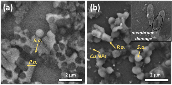 Figure 3 shows the SEM images of the mixed-species bacteria Staphylococcus aureus/Pseudomonas aeruginosa before and after their treatment with copper nanoparticles. The bacterium Staphylococcus aureus has a spherical shape, the size of which is in the range of 500–1000 nm. Pseudomonas aeruginosa, in turn, resembles elongated sticks (1–3 microns). After treatment with nanoparticles, a rupture of the bacterial membrane is observed.