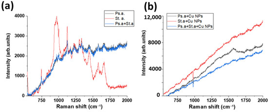 In order to take the Raman spectra, the samples were placed directly under a 50× microscope objective, and the laser spot was focused sequentially on the central surface of the bacterial colony. It was decided that the spectral range would be from 700 to 2000 cm−1 to cover the most suitable zone. Figure 6 demonstrates the Raman spectra of Staphylococcus aureus, Pseudomonas aeruginosa, and their mixture before and after treatment with copper nanoparticles. Prior to treatment with nanoparticles, the main peaks characteristic of either one or the other type of bacteria were clearly visible in the spectra (presented in Table 2). After processing, a strong luminescence occured.