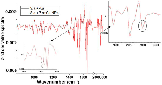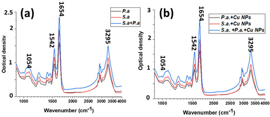 FTIR spectroscopy is a unique and non-destructive method for molecular composition and dynamics analysis [33]. In our work, FTIR spectra were taken for the bacteria Pseudomonas aeruginosa, Staphylococcus aureus, and their mixtures. Spectra were also taken for these bacteria when treated with copper nanoparticles (Figure 7).