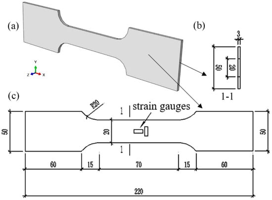 Mechanical properties of the Q235 steel are measured by the tensile coupon test according to the standard of GB/T228.1-2010 []. The dimensions of tensile coupon test specimens are presented in Figure 2.