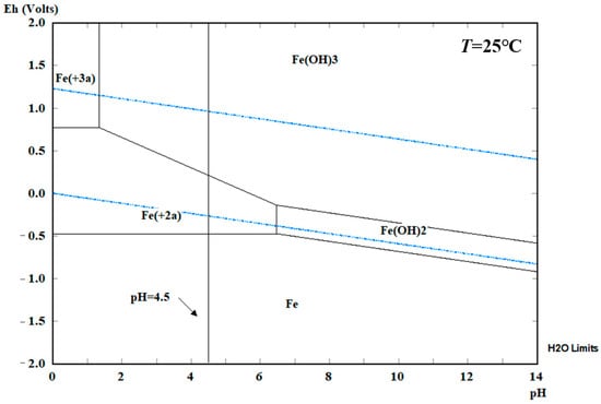 Figure 5 presents the potentiogram of steel specimens at 25 °C and one atm. It can be seen that high oxidation state substances are located above low ones. Solid substances are located on the side with a higher pH value, while dissolved substances are located at a relatively low pH. Figure 5 shows the area within the two blue lines is defined as the water stability area, iron exists as Fe2+ and Fe3+, which means that steel specimens are unstable in the solution. The pH value of the electrolyte in this paper is set as 4.50, the steel specimens in this condition present corrosion. Horizontal lines in Figure 5 represent the oxygen and proton reduction of the steel corrosion. Moreover, the steel used in structural engineering contains impurities, which will corrode due to acid rain in a lower pH value without a power supply in areas Ⅰ and Ⅱ.