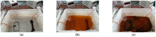 The test device is presented in Figure 3, which is mainly composed of a water tank, a stabilized power supply, an artificial electrolyte, and power cords. At first, the artificial corrosion solution is poured into the water tank. Then, three steel standard tensile coupon test specimens belonging to one group are immersed into the electrolyte and placed in parallel. The height of the electrolyte is no less than the 2/3 height of the water tank, meanwhile, the wood bricks of the same size are placed under the test specimens to ensure that the specimens are fully corroded. Subsequently, the positive and negative electrode of the stabilized power supply is connected to the steel specimen and conductive rod, respectively, as shown in Figure 3. According to Faraday’s law, the electrified time is determined by Equation (2):