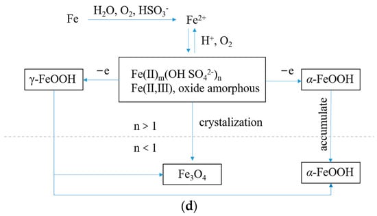 The initial corrosion products on the surface of Q235 steel are mainly Fe(II) and Fe(III) amorphous oxides with relatively high chemical activity, which uniformly cover the surface of steel specimens after reaching a certain cumulative amount. The formation of γ-FeOOH mainly comes from the crystallization reaction of amorphous components in the rust layer, while the formation of Fe3O4 may come from both the reduction and crystallization of amorphous components and the transformation of γ-FeOOH crystal form, as shown in Figure 6.