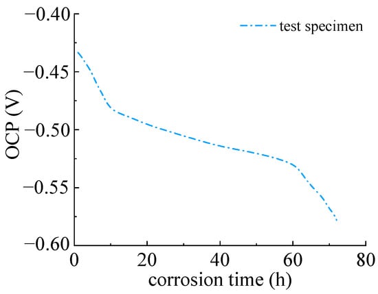 Figure 7 depicts the open circuit potential of the Q235 steel specimen within 72 h. It can be seen that open circuit potential decreased rapidly at the beginning. This is because of the initial corroded layer, which provides a formed passivation film on the surface of the steel specimen. The electrolyte solution and oxygen have not yet been reached. The corrosion potential remained at a relatively high value. The initial open circuit potential was −0.429 V and decreased to −0.578 V at 72 h. This indicated that the sulfate corrosion of Q235 steel started, the electrolyte solution and oxygen diffusion into the metal interface. The anodic reaction of steel accelerated with the decreasing of corrosion potential due to the large amount of porosity of corrosion products, which caused further electrochemical reactions.