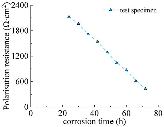 The polarization resistance curve of Q235 steel was presented in Figure 8. It can be seen that the polarization resistance decreased with the corrosion time, which illustrated that the corrosion was accelerated and the corroded area enlarged. The tendency of descending was obvious within the 72 h due to the fact that the corrosion products with limited impermeability since they are loose [].