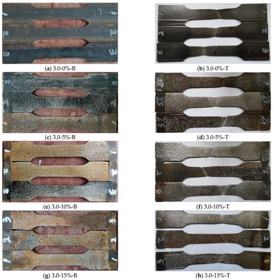 Comparison of standard coupon tensile test specimens with different corrosion rates before and after failure at a thickness of 3.0 mm. Note: 3.0-0%-B/T represents the steel specimen with a thickness of 3.0 mm, the corrosion rate is 0%, and B stands for steel specimen before tensile coupon test, while T stands for the steel specimen after the test.