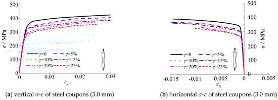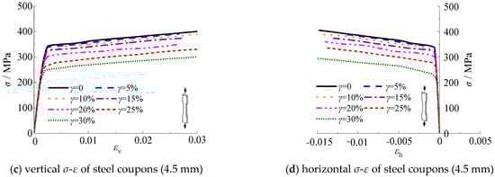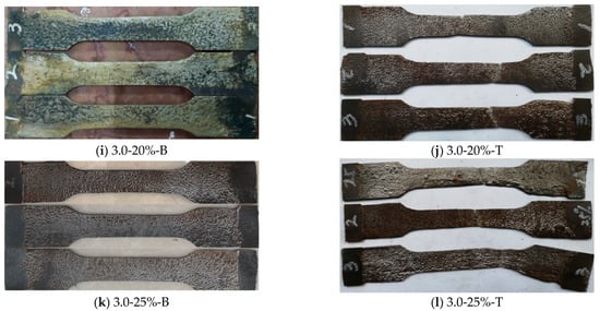 The test results of steel tensile coupon specimens with thicknesses of 3.0 mm and 4.5 mm are shown in Appendix A. The following rules are utilized to distinguish the specimen: (1) The first character “T” represents the tensile coupon specimen; (2) The second Arabic number represents the thickness of the steel; (3) The third Arabic number represents the corrosion rate; (4) and the last character “a (b)” represents the different specimen in the same group. The test results of tensile coupon specimens are listed in Figure 14.