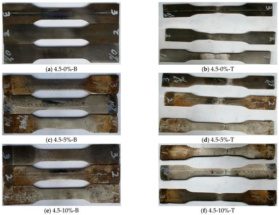 Comparison of standard coupon tensile test specimens with different corrosion rates before and after failure at a thickness of 4.5 mm. Note: 4.5-0%-B/T represents the steel specimen with a thickness of 4.5 mm, the corrosion rate is 0%, and B stands for steel specimen before the tensile coupon test, while T stands for the steel specimen after the test.