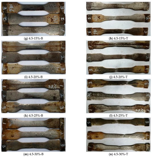 Figure 12 presents the failure mode of the steel standard tensile coupon specimens with a thickness of 3.0 mm. If the corrosion rate is within 10%, the fracture of the specimen presented a normal fault; while if the corrosion rate ranges from 15% to 25%, the fracture of the specimen will be the oblique fault. Figure 13 shows the failure patterns of steel standard tensile coupon test specimens with a thickness of 4.5 mm. It can be observed that the two types of failure modes exist and are influenced by the corrosion rate. The corrosion rate below 20% leads to a normal fault while the corrosion rate between 20% and 30% shows an oblique fault.