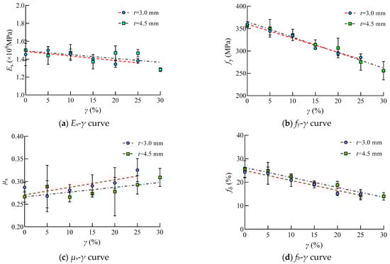 It can be seen that the value of the experimental elastic modulus, yield strength and elongation of Q235 steel decreased with the increasing sulfate corrosion rate despite the scatter of these test results. This was due to the pitting corrosion which caused the discontinuous in physical performance and local stress concentration of steel. However, the Poisson’s ratio of Q235 increased with the increasing sulfate corrosion rate, which indicated that steel changed from a plastic state to a brittle state.