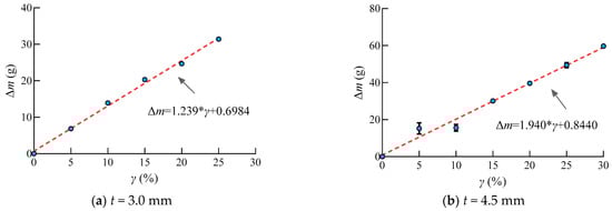 In this study, steel used in steel structures corroded at a rate of 0.06 mm/a. The corrosion rates 0%, 5%, 10%, 15%, 20%, and 25% correspond to the duration of 0, 2.5, 5, 7.5, 10, 12.5, and 15 years for the steel specimens with a thickness of 3.0 mm. The corrosion rates 0%, 5%, 10%, 15%, 20%, 25%, and 30% correspond to the duration of 0, 3.75, 7.5, 11.25, 15, 18.75, and 22.5 years for the steel specimens with the thickness of 4.5 mm. It can be seen that the Q235 steel weight loss with the increasing corrosion rate in Figure 15. The R square of the two linear regress formula is 0.9953 and 0.9793, respectively. However, it can be observed that the corrosion speed increased rapidly in the initial stage when the corrosion rate achieved 5%, corresponding to 2.5 years and 3.75 years for the 3.0 and 4.5 mm steel, respectively, when the weight loss was the most serious. This is because the rust layer avoided the sulfate corrosion, which caused the decrease in the corrosion rate in the later corrosion stage. This regulation matched the SEM analysis.
