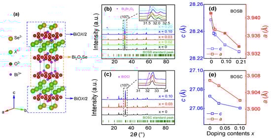 Characterization of BiOSeX (X = Cl, Br; x = 0, 0.02, 0.03, 0.10, 0.20) crystals. (a) Layered crystal structure of BOSX consists of alternative stacking of BiOX and BOS layers. Se (orange color) and X ions (green color) occupy the same anion site; however, the occupancy is different and has been marked in different volumes. Powder XRD patterns of (b) non-stoichiometric tuned BOSB and (c) BOSC. The inset is the zoomed-in figure around the (107) reflection, which shows that the peak positions gradually shift to the right as the doping concentration increases. The purple arrow is for eyes to see the trend in the inset subfigure (b,c). The impurity phase (BiBrO or BiOCl) emerges when the doping content x is larger than 0.1. The lattice constant as a function of doping content x for (d) BOSB and (e) BOSC.