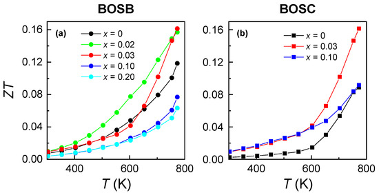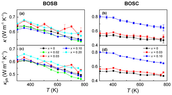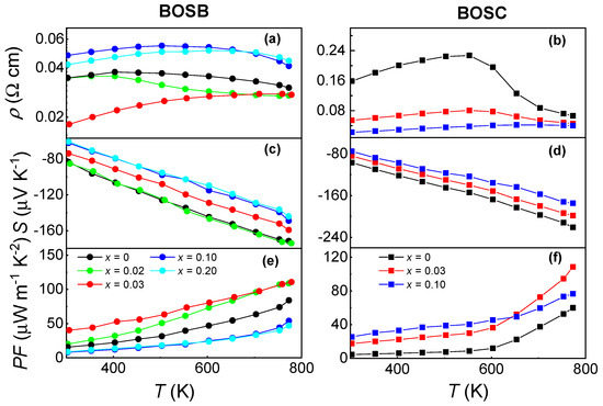 Figure 3a,b show the T-dependent resistivity () for BOSB and BOSC ceramics with various doping contents x. The transport parameters are included in Table 1. All samples exhibit metallic behavior near RT, i.e., increases monotonically with increasing T. However, at high T, the of samples with low doping contents x decreases with a rising T, indicating the domination of thermally excited carriers in electric transports. This phenomenon is reminiscent of the bipolar effect in TE materials, where an intrinsic excitation causes the conduction band electrons to cross the energy gap, resulting in an increase in the number of charge carriers involved in transport and a decrease in resistivity. However, no evidence of a bipolar effect was observed in the thermal conductivity and thermopower (as shown below). In addition, the large energy gap of BOSC ( 1.15 eV) [31] precludes the thermal excitation of electron–hole pairs.