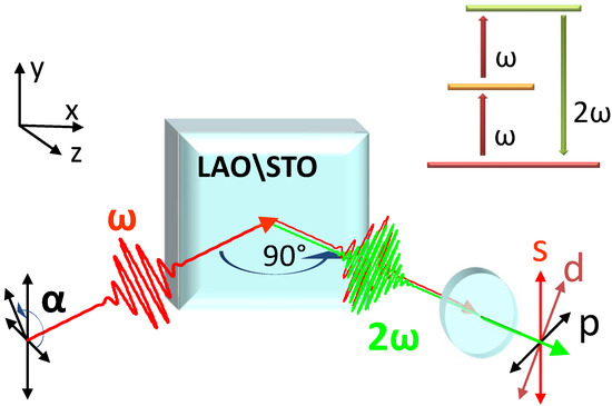 The optical Second Harmonic Generation (SHG) process is essentially the generation of a light wave with the frequency by doubling the frequency of the incident wave [30,31,32]. The measured SHG signal, i.e., the intensity of the double-frequency wave, is proportional to the absolute square of the second order susceptibility tensor . The SHG levels diagram and the basic idea of the experimental layout is given in Figure 1 together with the labeling of the axes and polarization directions. The model which describes the process will be addressed in the following section. Here, we would like to focus first on the most relevant point: because of the very thin region which is affected by the 2DEG, one needs a powerful and non-invasive technique specifically sensitive to thin interfaces, and SHG is ideal with respect to these issues. The reason for this lies in the sensitivity of SHG to the symmetry of the system. A very simple and general argument shows that, under the dipole approximation, the SHG signal vanishes in any centro-symmetric medium, i.e., when the system is insensitive upon inverting each ion position from the point to the point . This strong symmetry can be fully achieved, evidently, only if the material extends to an infinite size in space. The presence of a surface geometrically hampers the inversion symmetry, regardless of any property of the material, and, therefore, any interface (a surface is nothing but an interface with vacuum) acts as a source of SHG signal [33]. One can regard the issue also by looking at the alteration of the arrangement of the ions in the bulk; the breaking of the inversion symmetry in a condensed matter system corresponds directly to a shift of ionic and electronic charges, and the SHG probes the resulting polarization. It is very important to understand that, for the above mentioned reasons, there is no pre-determined “probing depth” of SHG, as there is for many other surface techniques, such as ARPES and others. The optical wavelengths typically employed in experiments are in the 100 nm to the micrometer scale, and the penetration length could be, depending on the specific material, up to meters or more. This is irrelevant as the bulk of the centro-symmetric material will be illuminated by the incident light, but it will not emit any signal. The emitting region of the SHG signal instead covers the region affected by the symmetry breaking, i.e., the region where the material differs significantly by its bulk structure.