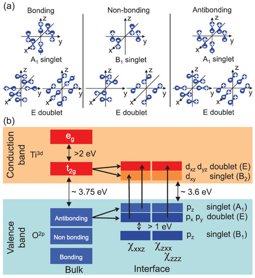 (a) Different arrangements of O (2p) orbitals forming the highest occupied molecular orbitals (HOMO) are indicated. In the bulk, they are grouped in triply degenerate levels according to the cubic symmetry, but at the surface the symmetry is broken (local symmetry) and the degeneracy between the singlet and doublet states is removed. (b) The O(2p)–Ti(3d) 2 transitions allowed for all three symmetry components within the symmetry group according to Equation (7). Reprinted with permission from Ref.[38].