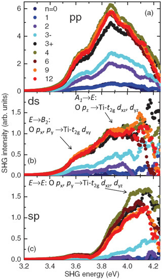 SHG spectra of LAO/STO hetero-structures for (a) , (b) , and (c) polarization configurations with different LAO thickness n. Samples with show strong sample-to-sample variation in SHG yield. This value of n represents a threshold for a discontinuous interfacial reconstruction which anticipates the conduction, i.e., the presence of free charge carriers. Here, the two extreme cases have been labeled with “+” or “−” in order to distinguish them, so that the “” sample is the one with the highest SHG signal, and “” the one with lowest SHG signal. These spectra cover the direct O(2p)→Ti(3d) band-gap transition of STO, which appears as an increase in SHG intensity at approximately eV. The symmetry-based SHG selection rules take into account that the lowest energy transition at eV is present in the spectrum of and , but not in . The same arbitrary scale is used in all three panels. Reprinted with permission from Ref. [38].