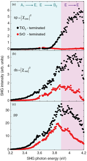Comparison of SHG spectra from LAO/STO hetero-structures with five LAO unit cells and different interfacial atomic terminations. The labels (a), (b), and (c) refer to different combinations of /2 polarizations (see text). The spectra for the SrO-terminated substrate (red symbols) are multiplied by a factor of 4 for better visibility. The colored areas divide the graph into two energy ranges corresponding to the identified electronic transitions: the blue area is dominated by A E, E → B transitions, while the purple area is driven by E→E transitions. Reprinted with permission from Ref. [39].