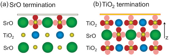 A schematic image of the two possible STO terminations. The 2p oxygen orbitals are shown in dark red and pink, where dark red highlights direction maximizing overlap with the Ti atom. In the case of SrO-terminated STO 2 orbitals point towards the underlying Ti atoms, thus favoring orbital overlap. Reprinted with permission from Ref. [39].