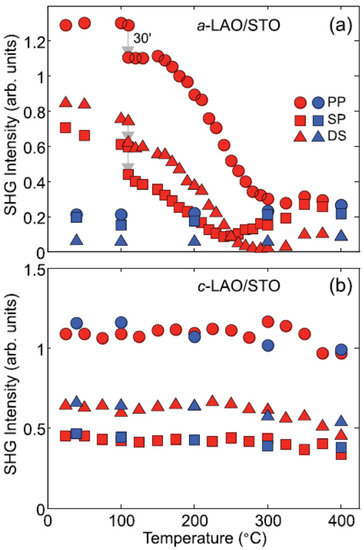 SHG intensity as a function of temperature for 10 equivalent-unit-cell thick a- and c-LAO/STO samples (panel (a,b), respectively), for three polarization combinations: (circles), (triangles), and (squares). Red (blue) points refer to the heating (cooling) stage. The arrow at 110 C indicates the beginning of the SHG signal decrease. At this temperature a pause of about 30 min (30’ label in the figure) is performed before continuing the temperature scan. Reprinted with permission from Ref. [46].
