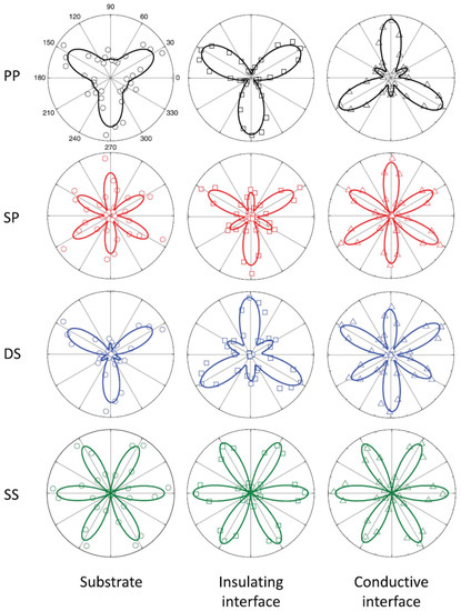 SHG Polarimetry: the signal is shown as a function of the azimuthal angle and polarization combinations (, , , ) for LAO/STO(111) samples. Open symbols are data and the solid lines are best-fit curves according to the 3 m symmetry group. Reprinted with permission from Ref. [37].
