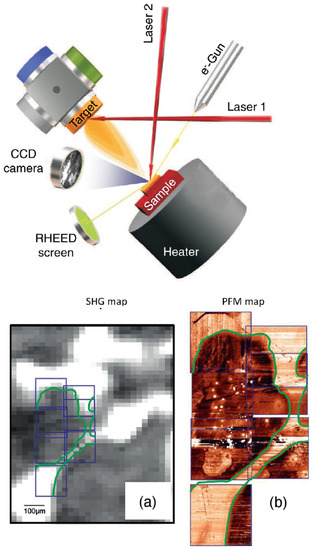 (Upper Panel): Schematic layout showing a possible device concept for in situ monitoring of epitaxial film growth by SHG. The usual geometry of the PLD chamber is not affected by the presence of an additional laser beam since both the source and the detector could be located outside the growth chamber. (Lower panels): (a) SHG intensity map on a SrTiO/NdGaO(110) sample and (b) PFM image of the same area showing the electrostatic potential measured in contact mode (bright regions correspond to a higher electron density). The colored lines are guides for the eye. Reprinted with permission from Ref. [56].