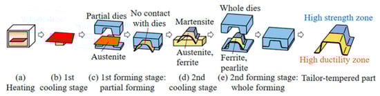 - Nakagawa, Y.; Mori, K.; Suzuki, Y.; Shimizu, Y. Tailored tempering without die heating in hot stamping of ultra-high strength steel parts. Mater. A Des. 2020, 192, 108704. [Google Scholar] [CrossRef]