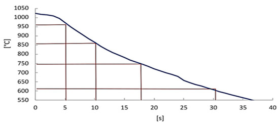 Using a thermocouple, the cooling curve of the sheet in the air was determined (Figure 7). Subsequently, the intercritical temperatures were determined from the CCT diagram. From the intersections of these cooling curve temperatures, the quench times in the tool were determined. These times were 5 s, 10 s, and 300 s. After transferring the entire sheet into the tool, quenching was performed for 5 s. This time was the same for all samples.