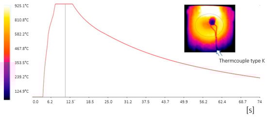 In the last stage of the experiment, the mechanical properties were changed only locally in a predefined region. The input for this part of the experiment was again the omega profile obtained by quenching in the tool for 5 s. Local annealing was performed after cooling the omega profile at RT by induction heating. This was a DHI 100 F induction heater from Dawell, which has a maximum power of 8 kW and an operating frequency from 18 to 45 kHz. The induction power was used at 25% with a residence time of 6 s. The temperatures achieved were in the range of 870 to 930 °C. The local heating was designed to simulate intercritical annealing in a local area and to significantly increase the ductility value in that area. The temperature was measured using a K-type thermocouple as well as a thermal camera, from which the images shown in Figure 9 are taken.